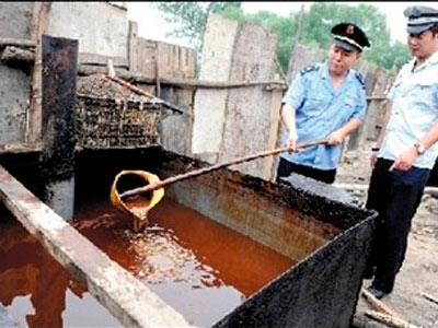 8月2日上午,朝阳孙河乡沙子营村附近一家加工地沟油的黑窝点,在工商、城管等执法人员检查时浮出水面。黑窝点老板称,加工油料使用的是从餐馆垃圾桶里收来,或从餐馆地沟捞出的泔水。他称地沟油准备卖给工厂做肥皂配料,并否认做食用油。有关部门将对油的去向进行调查。
